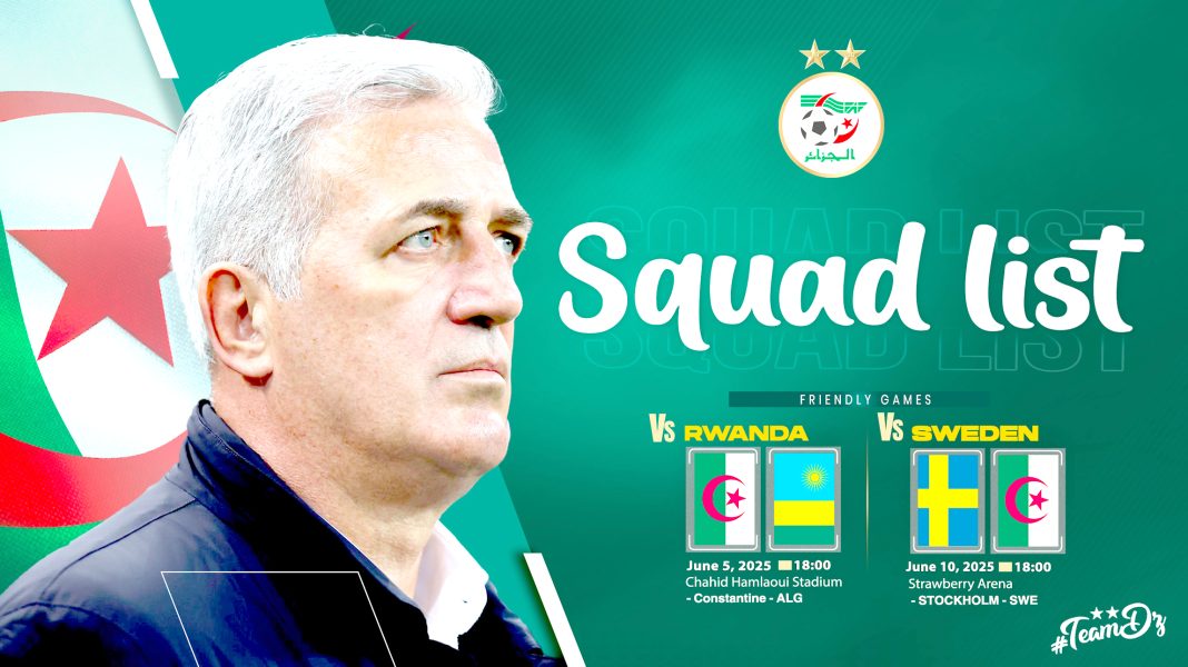 Les Verts accueilleront le Rwanda le jeudi 5 juin au stade Chahid Hamlaoui de Constantine (18h00), puis se rendront à Stockholm pour jouer face à la Suède, le mardi 10 juin au Strawberry Arena (18h00, heure algérienne). Ces deux rencontres entrent dans le cadre des préparatifs en vue de la reprise des qualifications de la Coupe du monde 2026 en septembre prochain.