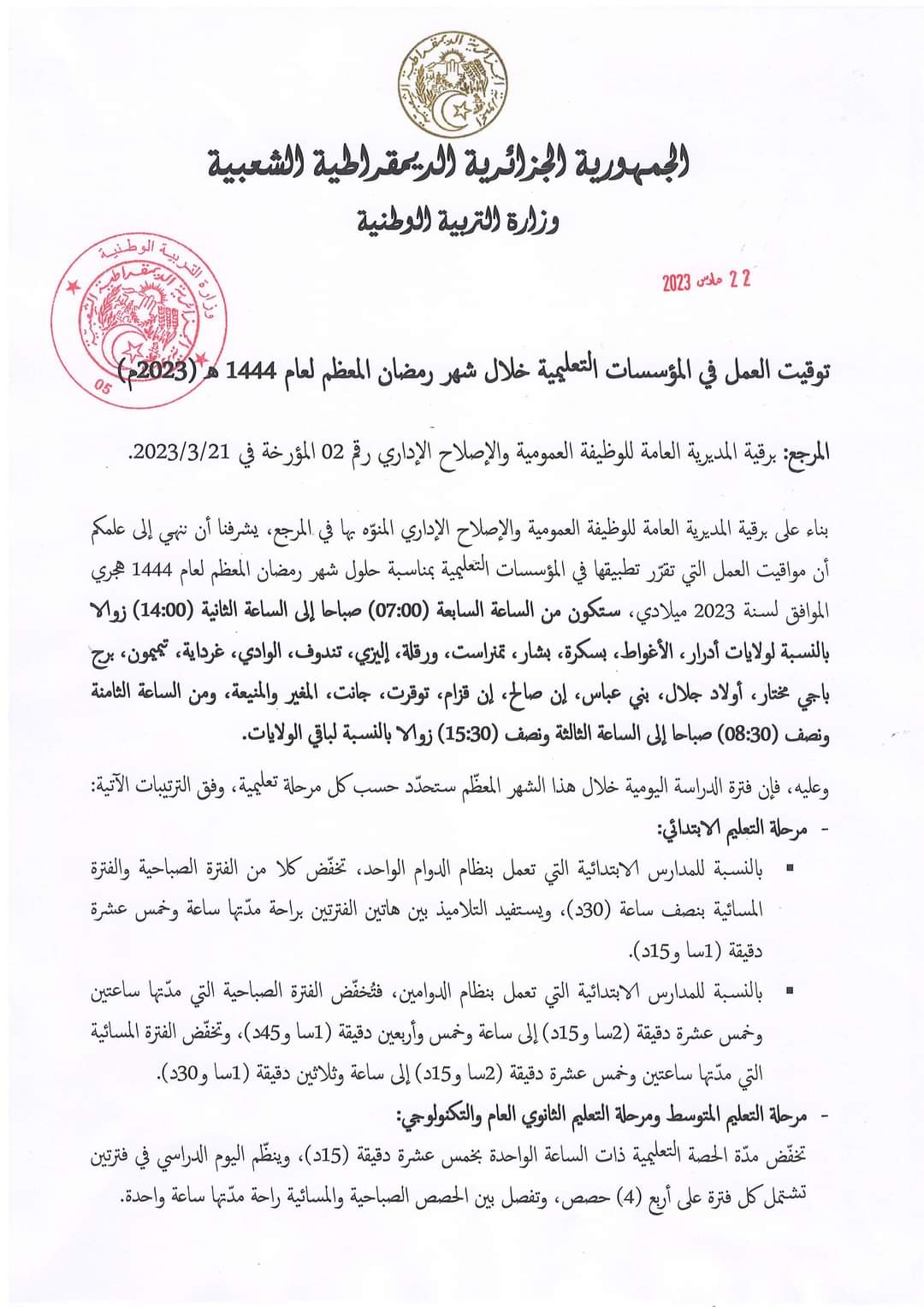 Le ministère de l’Education nationale a annoncé, mercredi dans un communiqué, les horaires de travail applicables durant le mois sacré de Ramadhan dans les établissements éducatifs à travers le pays. Pour les wilayas du sud, notamment Adrar, Laghouat, Biskra, Bechar, Tamanrasset, Ouargla, Illizi, Tindouf, El-Oued, Ghardaïa, Timimoune, Bordj Badji Mokhtar, Ouled Djellal, Béni Abbès, In Salah, In Guezzam, Touggourt, Djanet, El-Meghaier et El-Menia, les horaires de travail sont fixés de 7h00 à 14h00, précise le communiqué. Dans les autres wilayas du pays, les horaires de travail sont fixés de 8h30 à 15h30. Pour ce qui est de l’enseignement primaire dans les écoles à vacation unique, la durée des cours sera réduite de trente (30) minutes avec une pause d’une heure et 15 mn entre le matin et l’après-midi. Quant aux écoles primaires à double vacation, la durée des cours du matin sera réduite à 1h45, tandis que celle de l’après-midi sera réduite à 1h30mn. Dans les deux cycles moyen et secondaire, la séance pédagogique d’une heure sera réduite de quinze (15) minutes, a précisé le communiqué, ajoutant que l’emploi du temps sera réparti sur deux tranches englobant 4 cours chacune, avec une pause d’une heure entre le matin et l’après-midi.