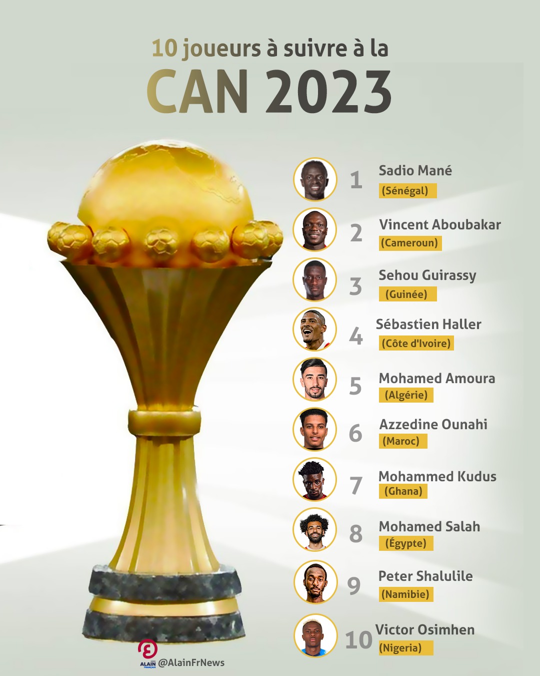 Dans quelques jours, l’Afrique va vibrer au rythme de la 34è édition de la Coupe d’Afrique des nations CAF TotalEnergies Côte d’Ivoire 2023. Pour cette grand’ messe, les stars du continent seront de nouveau très attendues. On vous propose un Top 10 des joueurs à suivre.